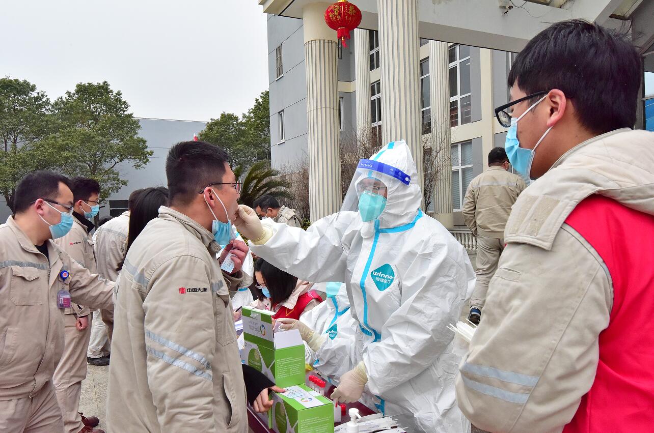 23日,在廠區(qū)臨時(shí)核酸檢測點(diǎn),防疫小組正在有序指揮著分批前來檢測的人員,職工們積極配合,采樣工作井然有序。