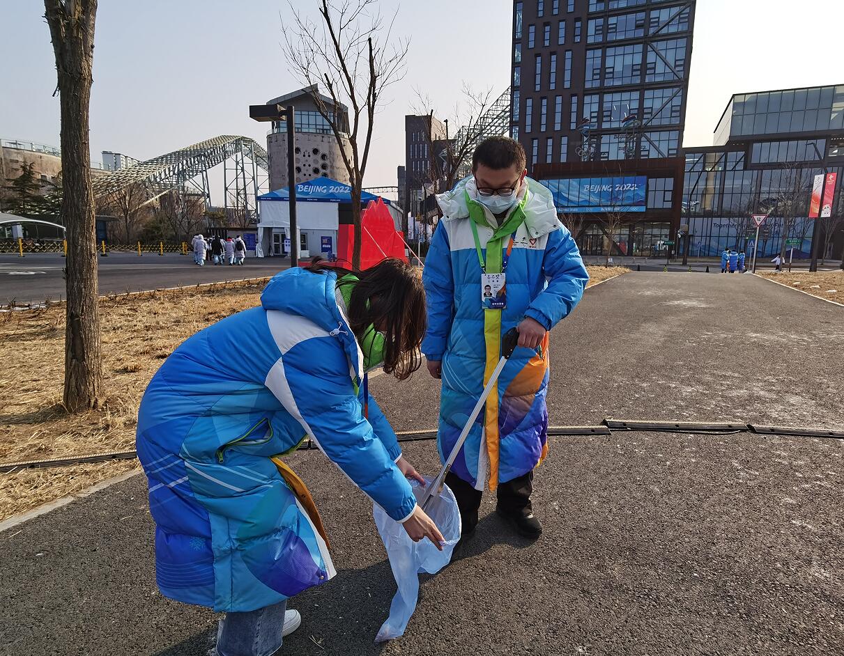 張睿娟與侯博文在冬奧組委總部附近拾撿垃圾,共同維護(hù)美好環(huán)境