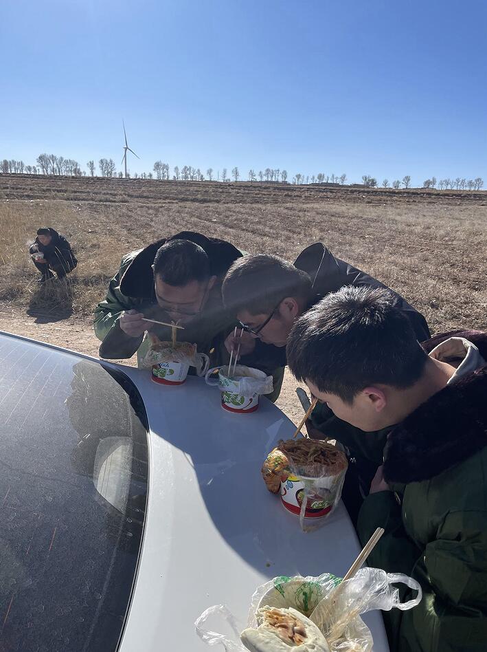 在風場值班時,一日三餐只能是泡面、自熱米飯這類速食品。為方便下班的同事吃飯、保證飲食安全,大家在住宿賓館附近選擇一家小餐館,作為值班回來就餐的“定點食堂”。接上完成交接班的同事們,我們一起去體驗了“食堂”。晚餐過程中,大家說說笑笑,精神狀態(tài)很不錯,完全看不出已經(jīng)在風場風餐露宿了兩周多時間。