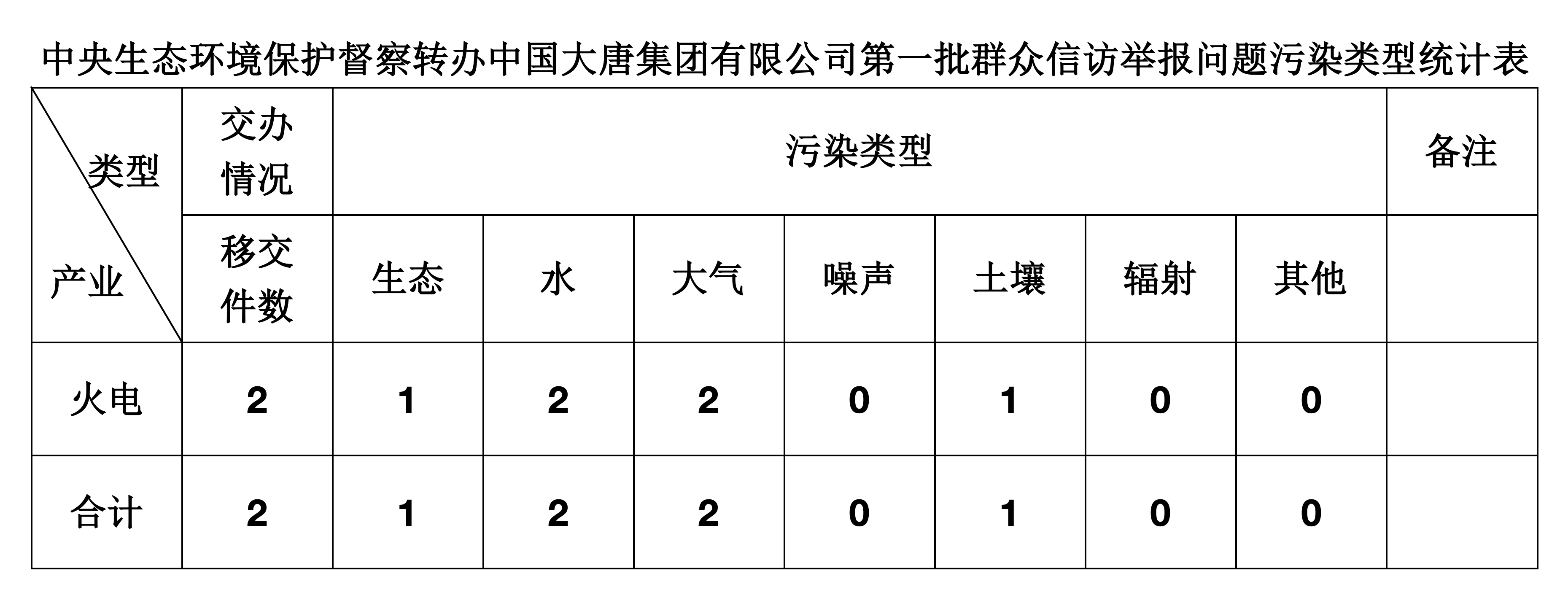 2025年5月30日,中央第七生態(tài)環(huán)境保護(hù)督察組向中國(guó)大唐集團(tuán)有限公司移交第一批群眾信訪舉報(bào)件,共計(jì)2件,均為來電舉報(bào)件,涉及生態(tài)問題1個(gè)、水問題2個(gè)、大氣問題2個(gè)、土壤問題1個(gè)。所有舉報(bào)件辦理工作已第一時(shí)間進(jìn)入調(diào)查核實(shí)辦理程序,辦理情況將按照相關(guān)要求反饋督察組,并及時(shí)向社會(huì)公開。