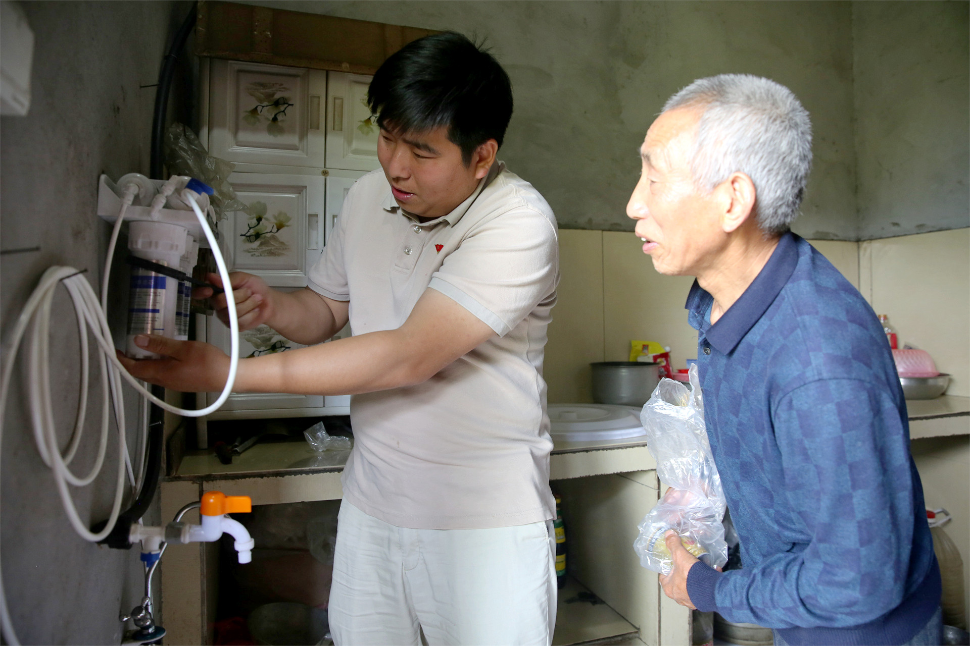 為老人查看了賬戶情況,陪老人聊完天,方名興處理了公務(wù)后,就趕著去老劉家?guī)兔Ω鼡Q凈水器濾芯——他家住在半山腰上。長期以來,老劉一家和周邊的4家住戶,都靠附近一處山平塘積蓄的雨水生活。天一熱,山平塘的水細(xì)菌、綠藻迅速滋生,散發(fā)出難聞的氣味。這樣的水很不衛(wèi)生,大家苦不堪言。